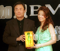 红遍内地、香港及台湾的艺人林心如28日在香港、台湾媒体的见证下,签约成为BMG唱片公司旗下歌星,BMG唱片公司崔震东先生并向林心如赠送一个琉璃如意,藉此祝福她的演艺事业更圆满如意。中新社传真 邓庆乐 摄