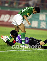 图:国安对红塔 区楚良飞身胯下救险