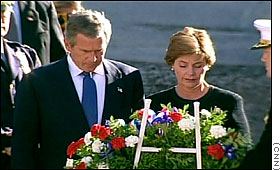 布什在第一夫人劳拉的陪同下,在曾经屹立着世贸中心双塔的空地上献上花圈,随后拥抱慰问遇难者家属。