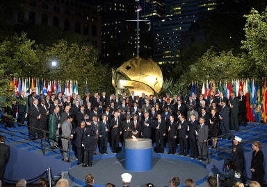罹难者人数最多的纽约世贸废墟是今天全美纪念活动的中心,数以万计的人今天早晨聚集在这里聆听每一位罹难者的名字,沿着长长的斜坡走进七层楼深的世贸废墟中为他们献花。当暮色降临的时候,距离世贸废墟不远的炮台公园点燃了一簇火焰,联合国秘书长安南、美国国务卿鲍威尔、纽约市长布隆博格以及中国外长唐家璇等来自罹难者家乡的代表一起举起点燃的蜡烛,悼念死难者。与此同时,纽约的五个行政区的公园里也聚集了众多的市民,摇曳的烛光寄托着对逝者的思念。
