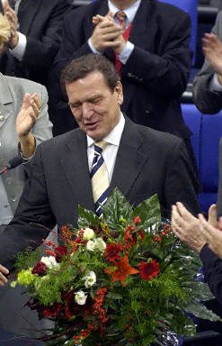 据国际在线报道,施罗德获得599票中的305票,超过当选所必需的302票,成功蝉联德国总理一职。