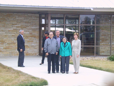 当江泽民和夫人王冶坪乘专车抵达牧场正门口时,提早迎候在那里的布什总统和夫人劳拉走向前去,与江泽民夫妇热情握手。布什说,这个牧场是我温暖的家,我和劳拉非常高兴在家里接待你和王冶坪女士。