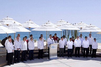 记者看到,上午八时半左右,墨西哥总统福克斯即在会场外一一迎候与会者。九时许,按APEC传统,与会领导人和代表着东道主提供的特色民族服装拍摄“全家福”。与上届上海峰会的中式唐装相比,今天的“瓜亚贝拉”同样极有“个性”,它是墨西哥东南部流行的一种传统服装,为精一色的白色,有四个胸袋。合照背景为太平洋碧蓝的大海,蓝白相衬,在美丽的洛斯卡沃斯留下了一道亮丽的风景线。