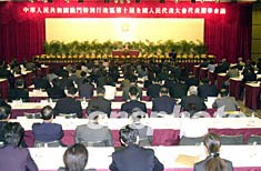 何椿霖代表全国人大常委会讲话。他说,我受全国人民代表大会常务委员会的委托,主持澳门特别行政区第十届全国人大代表选举会议第一次会议。2000年1月,澳门第一次作为独立的选举单位在澳门选举出7位第九届全国人民代表大会代表,同原由广东省人民代表大会选出的5位澳门代表,一起组成澳门特别行政区出席第九届全国人民代表大会的代表团。到明年3月,第九届全国人大代表的任期届满,需要选举澳门特别行政区第十届全国人民代表大会代表,这将是第一次由澳门居民组成的选举会议选出全部澳门特别行政区的全国人大代表。