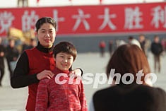 十一月五日,北京天安门广场完成了配合“十六大”召开而进行的新布置。一对母女兴致勃勃地与巨型“十六大”标语合影留念。作者:张炜