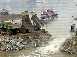 9时48分,自卸卡车向三峡导流明渠龙口倾倒了最后一批石料,滔滔江水被阻住去路。长江水全部改由北岸大坝底部的导流洞流往下游。
