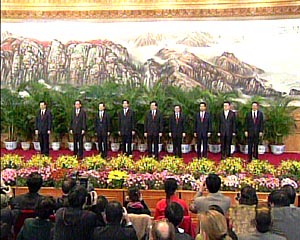 中新网11月15日电(记者 张朔)在刚刚结束的中国共产党十六届一中全会上,胡锦涛、吴邦国、温家宝、贾庆林、曾庆红、黄菊、吴官正、李长春、罗干等九人当选为新一届中共中央政治局常委。