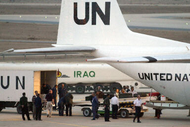 据悉,到巴格达的专家分别是6名来自联合国核子机构及12名负责搜查违禁武器的人员。目前已有大约二十吨包括通信器材、家俱、医疗用品等设备已运抵巴格达。