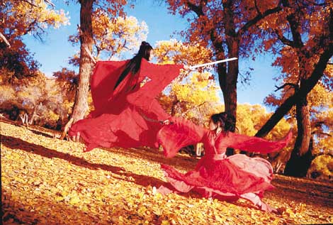 中新网11月27日电 张曼玉在电影《英雄》中除了跟梁朝伟于九寨沟瀑布前比剑外,还跟章子怡在内蒙古一处遍地黄叶的胡杨林中比武。虽然谁胜谁负,要在电影中才有分晓,但单论画面,意境就极之凄美。