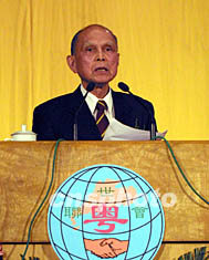 第二届世界广东同乡联谊大会三日在穗开幕,全国政协副主席霍英东在大会上致辞。作者:罗仰明