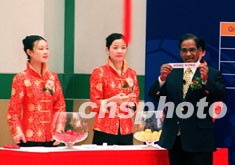 在祥和的中国民乐声中,来自北京大学的女大学生将印有中国香港、中国澳门和中国台北三队英文字样的字条从玻璃碗中一一取出,“找到”了各队的组别位置。这三支球队将分别参加第十三届亚洲杯足球赛预赛第一阶段D、E、B三组的比赛,争取杀入第二阶段预赛(既资格赛)。