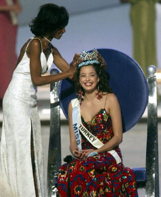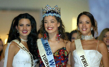 12月7日,在英国伦敦举行的“世界小姐”选美大赛中,土耳其小姐阿兹拉·阿金获得2002年“世界小姐”桂冠。来自全球的88名佳丽参加了本届大赛角逐。获得第二名和第三名的分别是哥伦比亚小姐纳塔利亚·佩拉尔塔和秘鲁小姐玛丽娜·莫拉·蒙特罗。中国小姐吴英娜获得第五名。