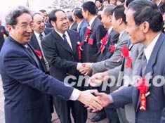 福建省政协主席陈明义(左一),十九日与出席福建省第七次归侨侨眷代表大会的闽籍港澳代表共叙乡情。作者:刘可耕
