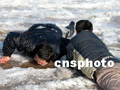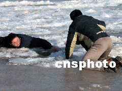 济南一市民3日到洛口观赏黄河封河奇观,结果不甚落入冰窟,幸亏同伴机智向救,才侥幸生还。3日,黄河出现了历史上少有的大范围封河现象,许多市民闻讯前来目睹这一奇观。河务部门提醒市民,虽然黄河已经冰封,但有些河面上冰层较薄,千万不要在上面行走。