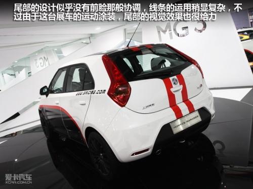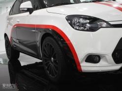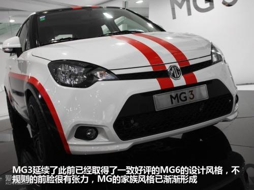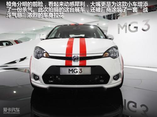 此次拍摄的这台展车,经过了厂家的轻度改装。主要是“身披”了一套战斗风格非常浓烈的车身拉花,以及4个黑色的赛车竞技风格轮毂,其余部分与量产车型无异。外观经过精心改造的MG3愈显有型,是一台非常火辣的运动型A0级小车。从前脸可以看出,MG3与MG6风格十分相似,显然MG品牌已经找到了属于自己独特的家族风格。