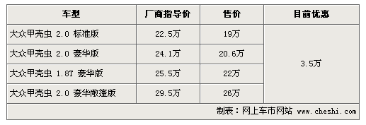 据4S店销售人员介绍:目前甲壳虫全系可优惠3.5万元,2.0标准版售价仅为19万,但目前硬顶版甲壳虫无现车,订车需等半个月至两个月。敞篷版目前现车较充足,喜欢的朋友可以不必等待漫长的订车时间。