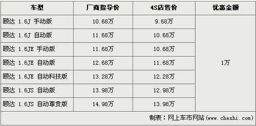据东风日产4s店销售人员介绍,目前颐达全系车型现金优惠1万元。经优惠后,入门级的1.6J 手动版车型售价从10.68万元下降到了9.68万元,高配的1.6JS 自动尊贵型售价也下降到了13.98万元。销售人员还介绍,目前店内没有颐达现车,欲购买者需交1000元订金约等一个月时间。