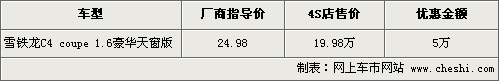 据4S店销售人员介绍,目前销售的C4轿跑车只有顶配1.6豪华天窗版,店内有银色和红色现车供应,数量有限。顶配版原来厂商指导价格为24.98万元,现在售价仅为19.98万,直降5万元现金,车价不足20万元。