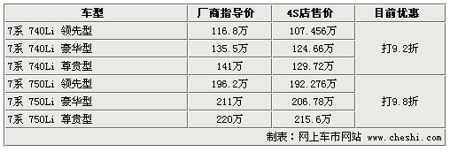 据4S店销售人员介绍:目前新7系现车较少,大部分需要预订。最快预定时间为2周左右,最长需等3个月以上。目前店内只有740Li领先型少量现车,,颜色有黑色及灰色。在优惠政策方面,740Li系列可以打9.2折,750Li系列可以打9.8折,喜欢的朋友可以到店内洽谈。