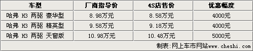 据长城汽车4S店销售人员介绍,长城哈弗H3的现车都比较齐全,并且出现了较多的优惠幅度。其中豪华型和精英型能够优惠4000元,而天窗版则优惠5000元。另外销售人员表示,长城哈弗H3的厂商指导价只是白色普通漆车型,金属漆其他颜色车型需要加价2000元。