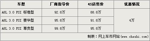 据北京奥迪经销店销售人员介绍,目前奥迪A8L的3.0L车型有4万元的优惠。经优惠后,3.0L标准型的售价从92.8万下降到了88.8万元,3.0L豪华型的售价从95.8万元下降到了91.8万元,3.0L尊贵型的售价也从99.8万元下降到了95.8万元。销售人员还介绍,店内目前没有现车,欲购买的消费者需交2万元订金,本月月底可提车。
