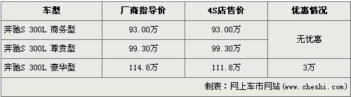今年的上海车展上,改款奔驰S级与消费者首次见面,据悉此款新奔驰S级将会在下个月正式上市。随着新款奔驰S级的即将上市以及宝马新7系入门级车型730Li的上市,现款在售的奔驰入门级车型S300L的价格会有什么变化呢?据了解,奔驰S 300L近期出现了最高4万元的优惠,具体价格详情请看下表: