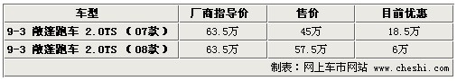 据4S店销售人员介绍:目前萨博9-3敞蓬轿车08款车型最高优惠6万元,07款车型更是达到18.5万元。无论是小编还是经销商处,都建议购买07款车型。08款与07款车型最大区别在于前脸部设计,在机械方面及舒适方面均无差别。目前店内无现车,但是预订07款车型仅需等待5天时间,预订08款车型需等待2周时间。作为一款整车进口车型,订车时间还是非常短的。
