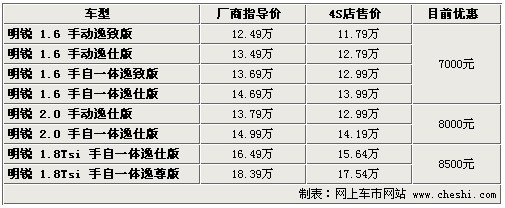 据4S店销售人员介绍:目前明锐全系最高优惠8500元。1.6升车型优惠已达7000元,较之前优惠幅度增加了1000元。2.0升车型优惠仍为8000元,1.8TSI的两款车型优惠8500元,较之前有所缩水。虽然1.6升车型优惠幅度较之前有所增加,但目前全系依然没有现车,订车最短需等一个半月,最长需等3个月。不过,某些店内有很少量现车,是订车客户已退车辆。但优惠幅度较小,所以建议不着急用车的朋友预定车辆可获得以上优惠。如在店内做装饰还可打8折,虽然折后装饰价格仍有些偏高,但产品质量可以保证。