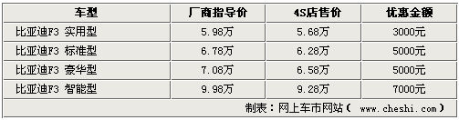 据比亚迪汽车4S店销售人员介绍,比亚迪F3白金版的四款车型目前在店内都有较大的优惠幅度,其中豪华型和标准型可以优惠5000元。而F3实用型目前的优惠幅度则只有3000元。最高配的智能型优惠幅度最大,可以给出7000元的现金优惠。