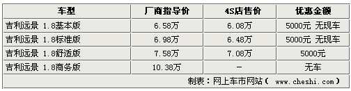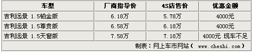 作为一款上市时间较长的车型,吉利远景系列近期也开始加大优惠幅度促销。网上车市网站近日由经销商处了解到,现在购买远景车型,将享受到最高5000元的现金优惠,不过各家4S店内的车型并不齐全,部分车型仍处于无车的状态。具体详情如下: