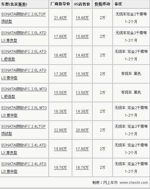 作为SONATA御翔的换代车型-----北京现代索纳塔领翔于08年底正式上市销售,是结合了韩国现代最先进的造车技术,凭借着大气稳重外形,宽大空间,乘坐性高,强劲动力等较高的综合性价比屹立于中级车之林。根据网上车市价格监测系统显示,目前领翔全系现金优惠2万元,现车不全,具体车型需预定,具体行情如下: