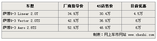 据4S店销售人员介绍:目前萨博9-3现车较充足,最高优惠可达6万元,标准型萨博9-3目前优惠4.5万。如需订购颜色较少的车,等待时间在1-2周左右。