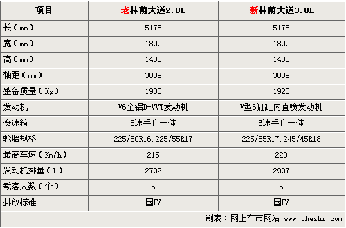 新款林荫大道3.6L车型排量没有提高,但整备质量提高了25 kg。轮胎从原来的225/55R17升级到245/45R18,提高了车辆的稳定性能。更换的6速变速器也使车辆最高车速由215公里提高到220公里。