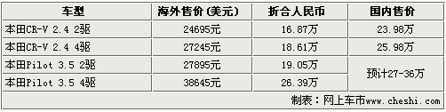 通过同属本田旗下的SUV车型——CR-V可以看出,这款车型在美国的售价为2.46万美元(折合人民币约为16.87万),而同款CR-V在国内的售价为23.98万元,其中间差价为7万元左右,所以我们预计这款中级SUV的售价将在27——36万左右。