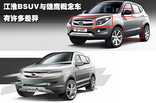 江淮BSUV是以雄鹰概念车为原型打造的一款小型SUV,虽然没有RAV4那样的身材,但整车的侧面造型和前引擎盖的线条都与RAV4非常相似,让人一眼看上去会联想到缩小了的RAV4。江淮BSUV的外形设计非常动感时尚,相信会迎合国内很多消费者的胃口。