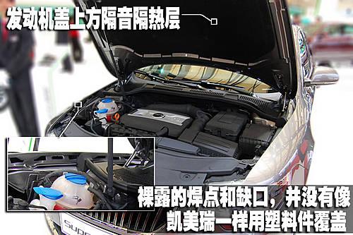 斯柯达昊锐的发动机舱布局也是比较整齐,位于发动机盖上方的隔音隔热层非常厚实面积也很大。但是记者注意到在前翼子板内侧制造中留下的工艺孔并没有像凯美瑞一样用塑料件覆盖。
