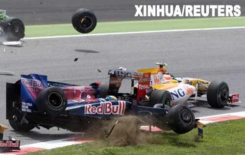 5月10日,红牛二队车手布尔代(左)驾驶的赛车在碰撞之后腾空。当日,F1西班牙大奖赛落幕,布朗GP车队的英国车手巴顿夺得冠军。新华社/路透