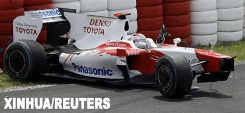 5月10日,丰田车队车手特鲁利驾驶的赛车发生碰撞后停下。当日,F1西班牙大奖赛落幕,布朗GP车队的英国车手巴顿夺得冠军。新华社/路透