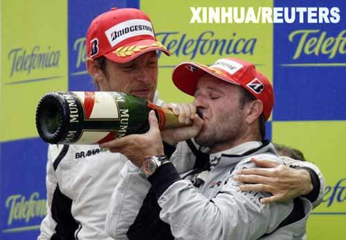 5月10日,布朗GP车队的英国车手巴顿(左)和队友巴里切罗庆祝胜利。当日,在F1西班牙大奖赛中,巴顿夺得冠军,巴里切罗获得亚军。新华社/路透
