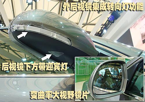 位于两侧外后视镜的设计融合了时下高端车型的诸多元素,例如带有侧面转向灯功能以及可以在夜晚照亮车门下方的迎宾灯功能,变曲率的大视野后视镜在车内的观察效果非常好。