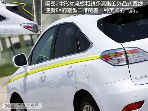 由于车身高度降低了40毫米,低矮的车顶更接近于一般轿车,整体感十足的镀铬门框饰条,使新一代RX在视觉上要显得更为稳健。由于采用了车厢前移的设计,A柱的小三角窗不可避免,不过溜背的尾柱处理得更优美,配合尾部Z字形的扰流板和线条清晰的外凸式腰线,使新RX的造型中暗藏着一种英武的气质。