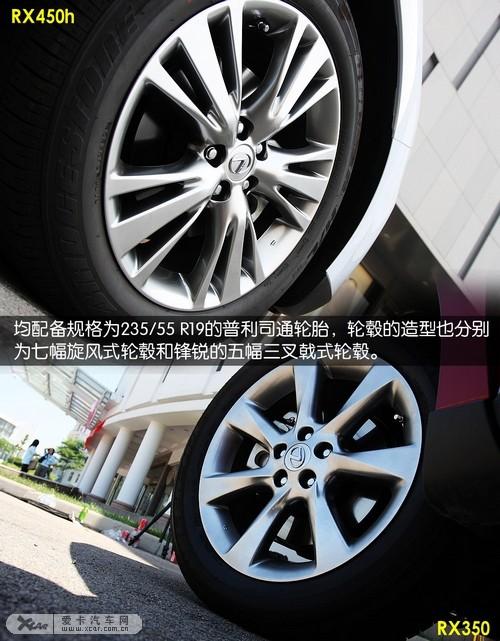 此外,新一代雷克萨斯RX350和RX450h均配备了规格为235/55 R19的普利司通轮胎,轮毂的造型也分别为七幅旋风式轮毂和锋锐的五幅三叉戟式轮毂,配合镶嵌银色镀铬饰条的内凹式侧裙,散发着亚光银光泽的轮圈优雅中带着动感。