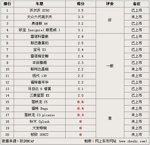 从上图中的欧洲NCAP测试统计中可以看出,以安全著称的沃尔沃确实有实力,XC60以3.5的高分位列第一名,紧随其后的大众新高尔夫和奥迪新A4,欧宝Insignia(即新君威)也获得了3.1分,四款车都获得了好的评价,其中除了新高尔夫即将国产之外,其他三款都已在国内市场销售。有好的就有差的,即将国产的雪铁龙C5仅获0.6分,而铃木Splash、大发特锐、标致308CC意外的评为零分,在碰撞中毫无保护可言甚至可能会对颈部造成危险,而铃木Splash还将在昌河铃木投产,不知到时能否获得改进。