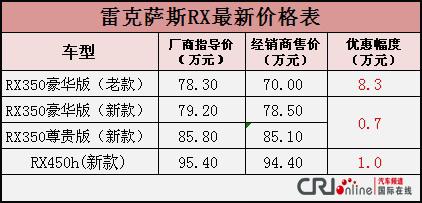 新款RX350分别为豪华版和尊贵版两款车型,近期购买RX350新款的消费者可以得到7000元的优惠。销售人员还介绍,刚刚上市的RX450h车型货源相对比较紧张,所以只有1万元的优惠,而且目前还有老款RX350的库存车,优惠幅度较大,达到了8.3万元,售价达到70万元。详细优惠信息如下: