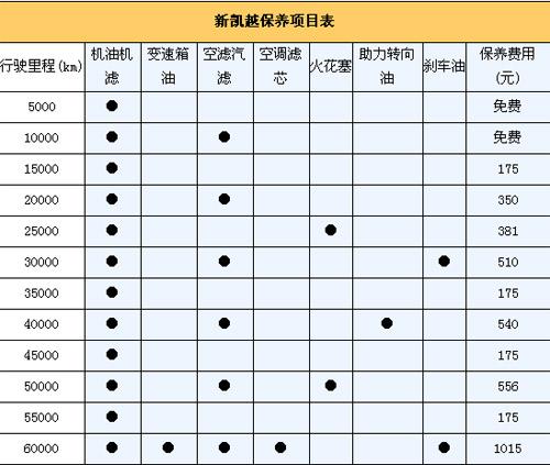 新凯越每次的保养间隔为5000km,首保免费。保修政策为2年/6万公里保修(以先到为准)。为了方便计算,我们以一年行驶2万km为标准,那么新凯越一年要做四次保养。由下表可知其一年保养费用1400元。