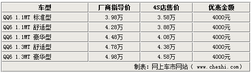 同样较受关注另外一款奇瑞微车—QQ6也有较多的优惠。据销售人员介绍,奇瑞QQ6目前全系可以优惠4000元,最低配的标准型以及最高配的1.3豪华型现车不足,部分颜色需要预订。