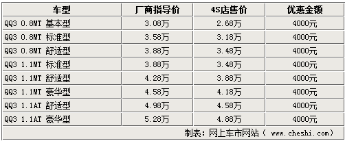 据销售人员介绍,奇瑞QQ3系列车型比较齐全,只有1.1AMT车型现车较少。但目前QQ3全系都有一定的优惠幅度,除现车较少的车型需要提前预订以外,全系车型均可以优惠4000元。