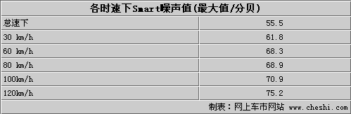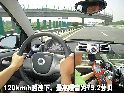 也许有人会担心smart这么小的车隔音和密封性是否有问题,为此我们在北京北四环路中关村附近进行了测试,在车外我们测得了最高77分贝的环境噪声;而当我们进入到车内噪声指数立即下降了22分贝之多,55分贝的水平几乎达到了办公室的安静程度。