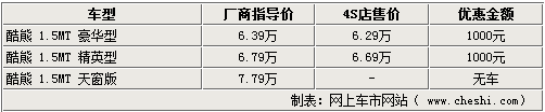 长城酷熊作为长城汽车在市场上推出的第三款轿车产品,凭借极具个性的造型和宽大的内部空间,使很多消费者都对其非常感兴趣。新车价格分别为豪华型6.39万元、精英型6.79万元,天窗版7.79万元。近日,网上车市网站了解到,长城汽车4S店处的天窗版酷熊仍然是有价无车的状态,其他两款车型有现车销售,可以给出千元的优惠。具体详情如下: