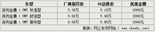 据北京地区吉利4S店销售人员表示,吉利金鹰目前只有1.5手动标准型有现车销售,自动版车型则没有现车,暂不接受预订,现在购买吉利金鹰手动版车型,全系都可以优惠3000元,在享受国家政策优惠的基础上更加具有吸引力。而全新的替代车型将属于吉利的全球鹰品牌之下,车型代号为GC515,有望在明年年初推出。